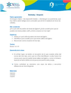 Poco tiempo luego de que los Hijos de Israel Salieron de Egipto, el Faraón los persigue para forzarlos a volver; los Israelitas se encuentran atrapados entre el ejército del Faraón y el mar. Di-s le dice a Moshé que eleve su bastón por sobre el agua; el mar se abre para dejar pasar al pueblo judío, y luego se cierra sobre los egipcios. Moshé y los Hijos de Israel cantan una canción de alabanza y agradecimiento a Di-s.Parasha KITAH (8–9 AÑOS)